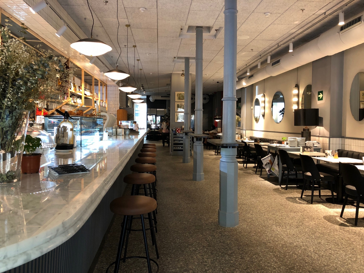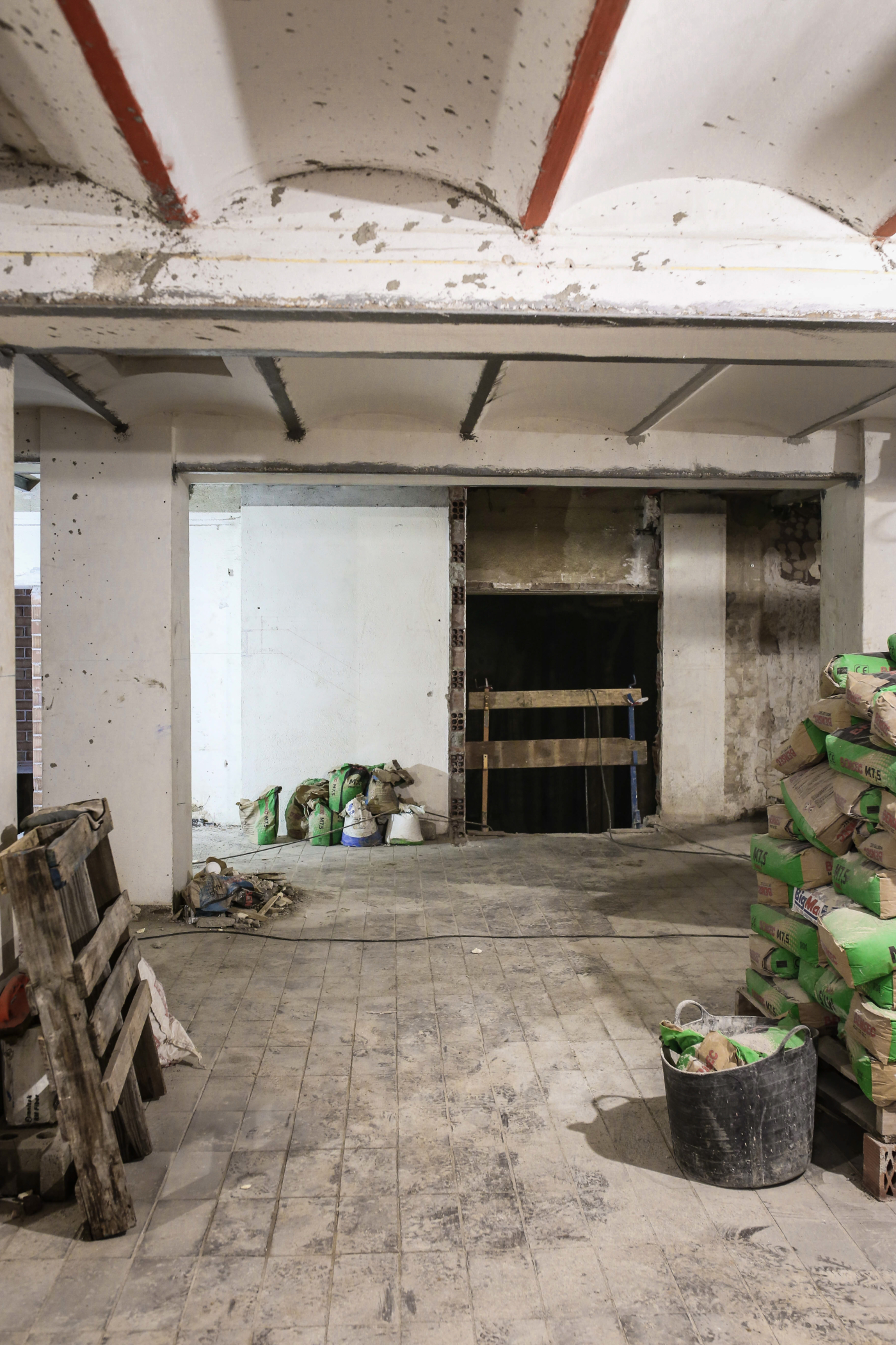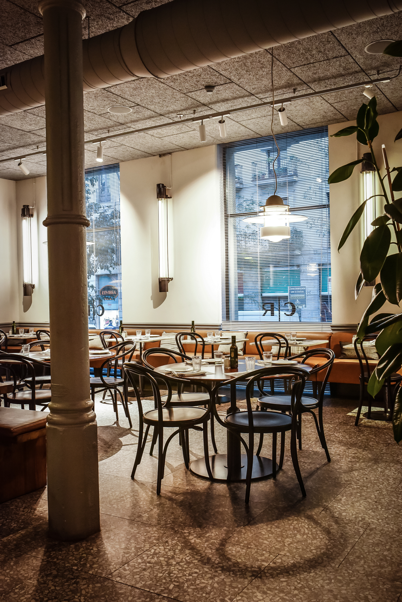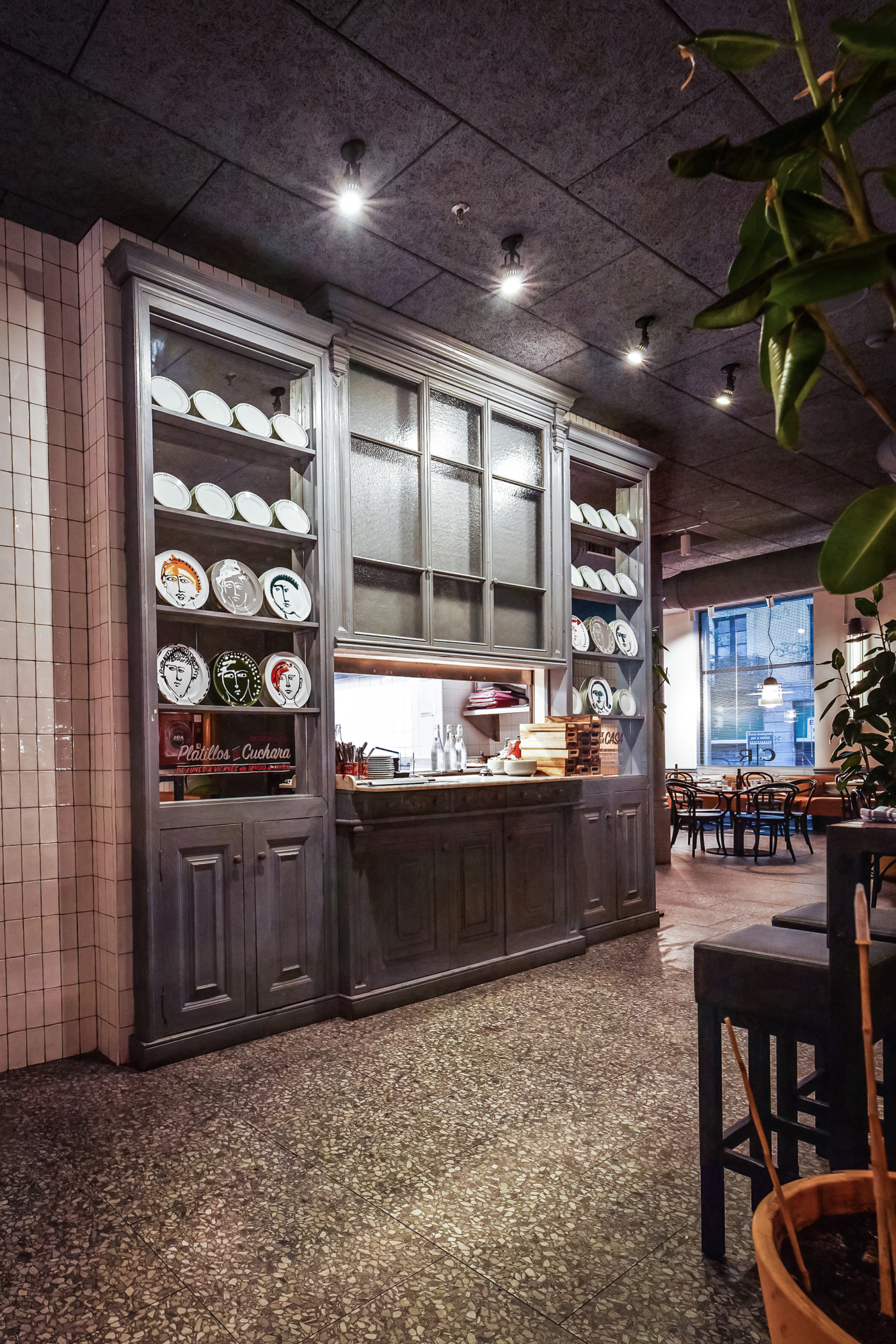 Para pasar de una funcional ferreter铆a a un acogedor restaurante se formaron nuevos vanos divisorios para distribuir los espacios (aseos, almacenes, cocina) y se formaron las barras en planta baja y s贸tano. Adem谩s, se coloc贸 nuevo pavimento para todo el local y se instal贸 un falso techo ac煤stico.聽